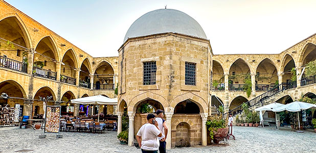 Leaving the villa, you will cross the Green Line with our guide and enjoy leisure time at Buyuk Han. It was a caravanserai during the Ottoman period, with an Islamic prayer room in the courtyard. The first floor was used as warehouses and stables, while the second floor was used as a resting place for the caravanserai merchants. Nowadays, it has been developed into a commercial area with many craft stores and restaurants. You can try Börek, a kind of Turkish pancake filled with minced meat, spinach, or cheese. You can have it with a cup of Turkish coffee or tea.