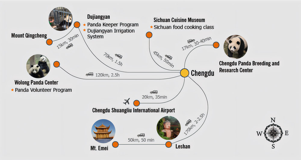 Normally it takes one or two full days to explore the popular attractions in Chengdu. Top of the list comes the Research Base of Giant Panda Breeding, where you can get really close to the adorable pandas. Besides, the Jinsha Site Museum, Sanxindui Museum, Dujiangyan Irrigation System, Wide and Narrow Alleys, as well as Jinli Street are the places most tourists choose to visit.