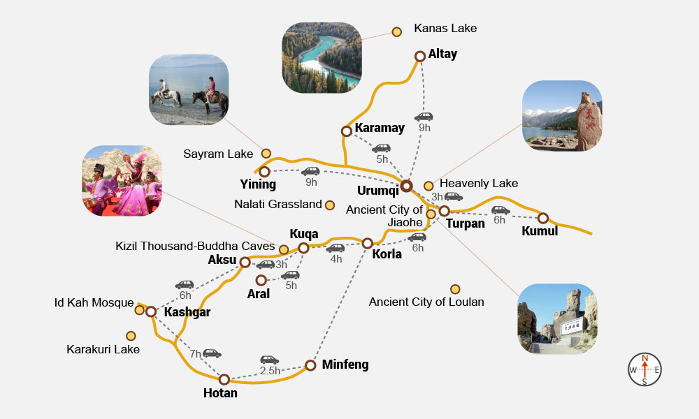 With vast territory and long borderline, Xinjiang boasts of its charming natural beauty and abundant cultural sites. When taking a Xinjiang tour, you will be fascinated by the histories of Turpan, Kashgar, Kuqa and other towns along the way. The Ancient City of Jiaohe, Loulan Ruins and Kizil Thousand-Buddha Caves show you the prosperity of the ancient Silk Road. Furthermore, Kanas Reserve, Yadan Landform and the boundless grasslands and deserts will add more fun if you love to adventure.
