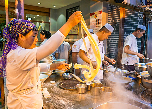 Today we provide you with a special a la carte lunch at the Muslim Quarter, to taste local foods, like Chinese Burger, Biang Biang Noodles, Fried Beef Dumplings, and Cold Noodles with Sesame Paste. We particularly recommend you to try the Chinese Burger. The succulent shredded beef sandwiched into two halves of flatbread will make your day.
