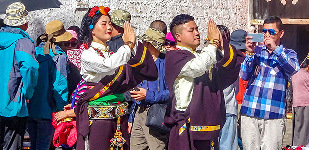 After lunch, we will go to the Jokhang Temple, one of the most famous landmarks of the region and the Buddhist center for some important Buddhist ceremonies or activities. Only about 2 km (1.24 mi) from the Potala Palace, this Tibetan spiritual heart allures visitors for its glamourous architecture incorporating Tibetan, Tang, Nepali, and Indian styles, and numerous Buddhist treasures including the life-size sculpture of 12-year-old Buddha Jowa Sakyamuni. The sightseeing will then be extended to the thriving bazaar of Barkhor Street, a famous business center as well as the place for wheeling the prayer wheels in Lhasa, where you can find some pretty interesting commodities, experience the Tibet folk customs and taste some local food. The last destination today is the Ani Tsankhung Nunnery, the only nunnery in Lhasa downtown area, offering you a good chance to learn about how women Buddhists study Buddhism and have a glimpse into their life.