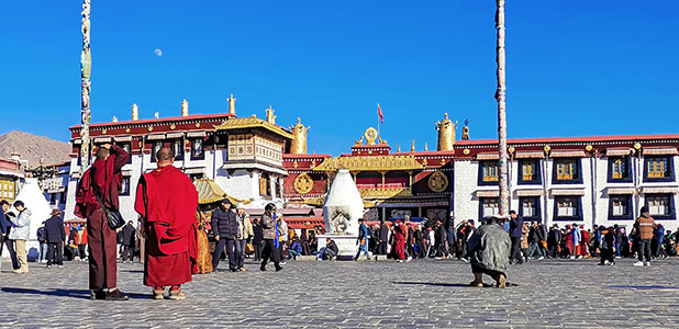 After Breakfast, let’s embark on a pilgrimage to the UNESCO-listed Potala Palace, the world’s most intact, largest, and highest ancient palace complex. It is not only the thousand-plus-year-old sacred mecca founded by Songtsen Gampo, the most well-known Tibetan king who founded the Tubo Regime in the 7th century, but also the background image of the RMB 50 banknote. It mainly consists of the Red Palace in the center, which is used for holding religious activities, and the White Palace for the governance and daily life of Dalai Lamas, on both sides. As you visit, you may find that the exterior walls of the Palace still look as white as new after more than 1,000 years of vicissitudes. That is because they are painted once a year as the Tibetan New Year approaches. Surprisingly, the paint is added with yak milk and sugar brought by the local Tibetans from their homes, so the walls are said to be sweet. Get ready to marvel at the largest stupa, which is luxuriously made of 3,721 kilograms of gold and inlaid with 18,888 natural gemstones. Also admire the oldest building here, the Fawang Cave, where you may learn the historical stories of Songtsen Gampo and Princess Wencheng from our guide while looking at their statues. After that, revel in the local folk activities in the Zongjiao Lukang Park at the foot of the Palace.