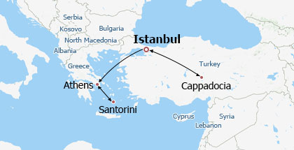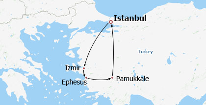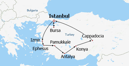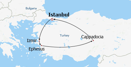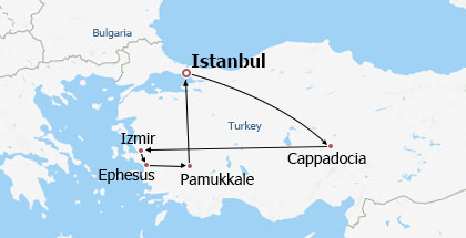 Istanbul, Izmir, Ankara, Antalya and Cappadocia are major tourist cities and regions in Turkey. Istanbul is a great city with impressive architecture, historical sites and exotic foods. Izmir will present you with the best reserved ancient wonder Ephesus and the fantastic nature's masterpiece, Pamukkale. Ankara is the capital city of Turkey. Antalya is a beach holiday paradise with Turkey's turquoise coast. Cappadocia has much more to discover beyond a hot air balloon ride. Usually, a Turkey Tour of 9 to 14 days is recommended if you would like to cover the most highlights.